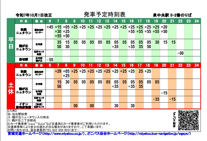 ※最新の時刻表は宮城県交通HPでもご確認ください。(鶴が丘ニュータウン線<住宅前経由> 鶴が丘:ニュータウン行き、または松陵ニュータウン線<運転免許センター経由>松陵ニュータウン行き)